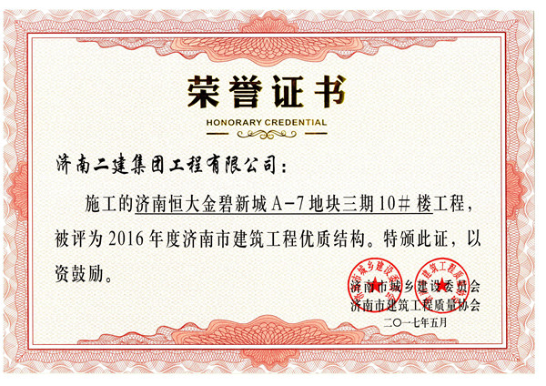 恒大金碧新城A-7地塊三期10#-2016年度濟南市建筑工程優質結構