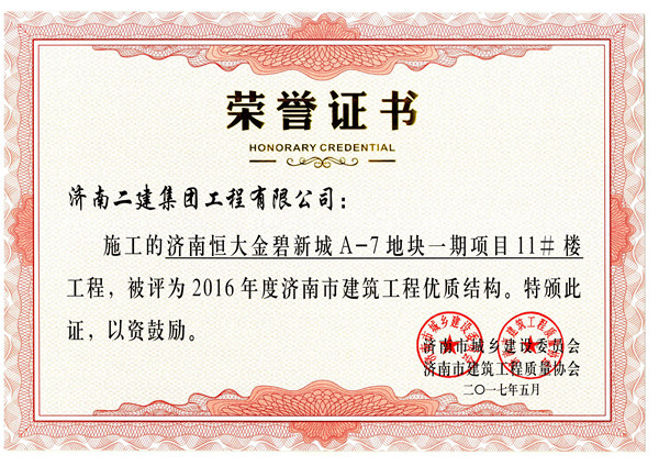 恒大金碧新城A-7地塊一期11#-2016年度濟南市建筑工程優質結構
