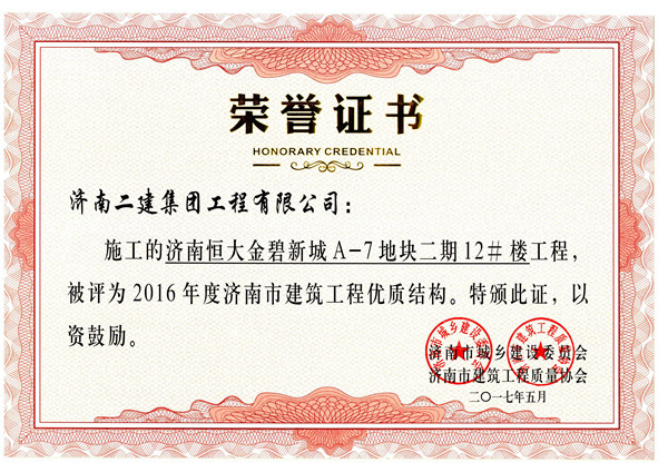 恒大金碧新城A-7地塊一期12#-2016年度濟南市建筑工程優質結構
