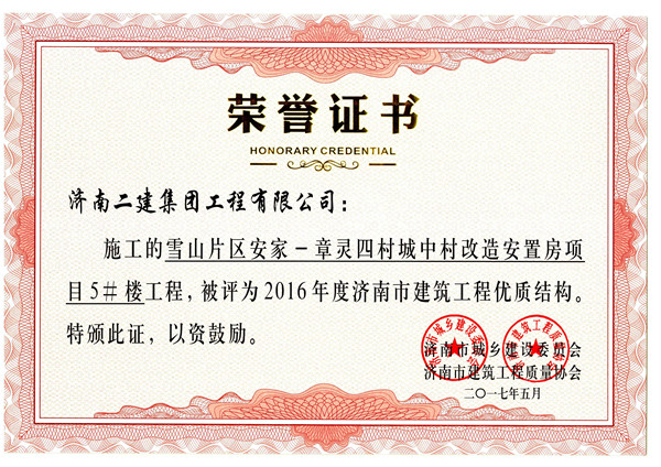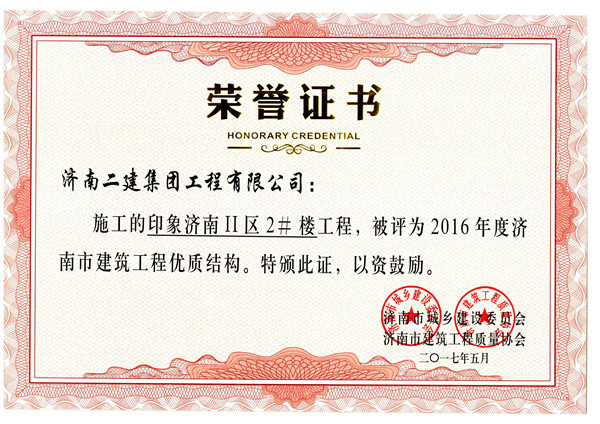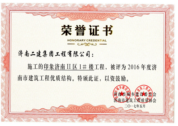 印象濟南II區4、5#被評為2016年度濟南市建筑工程優質結構