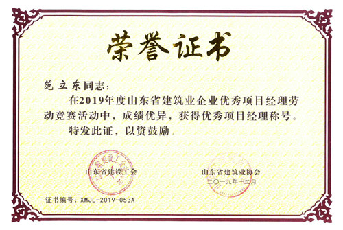 范立東同志獲得2019年度山東省建筑業企業優秀項目經理稱號