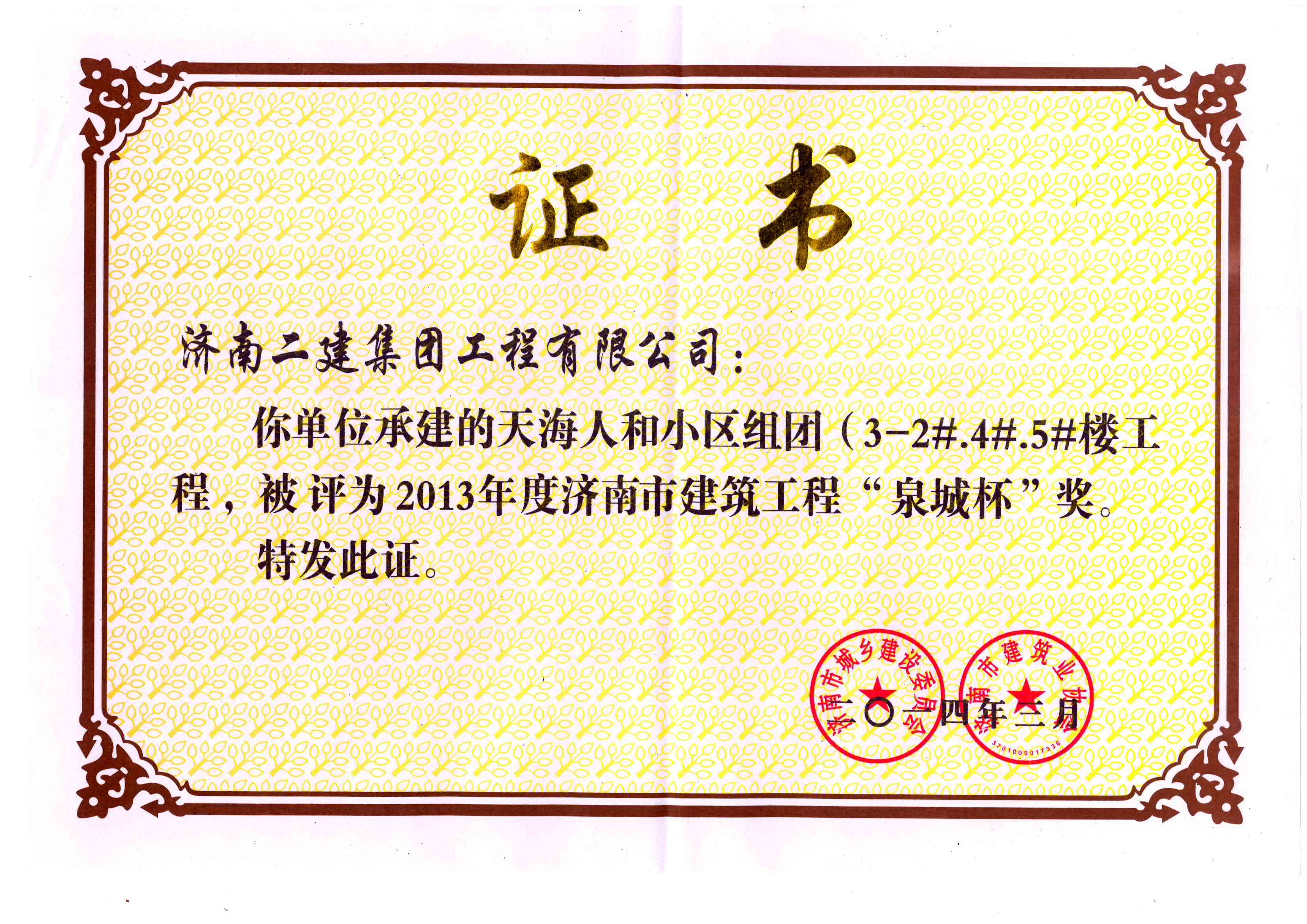 我公司承建的天海人和小區(qū)組團(融基·皇冠假日花園1#、2#、3-1#、3-2#、4#、5#樓),榮獲2013年度濟南市建筑工程“泉城杯”獎。