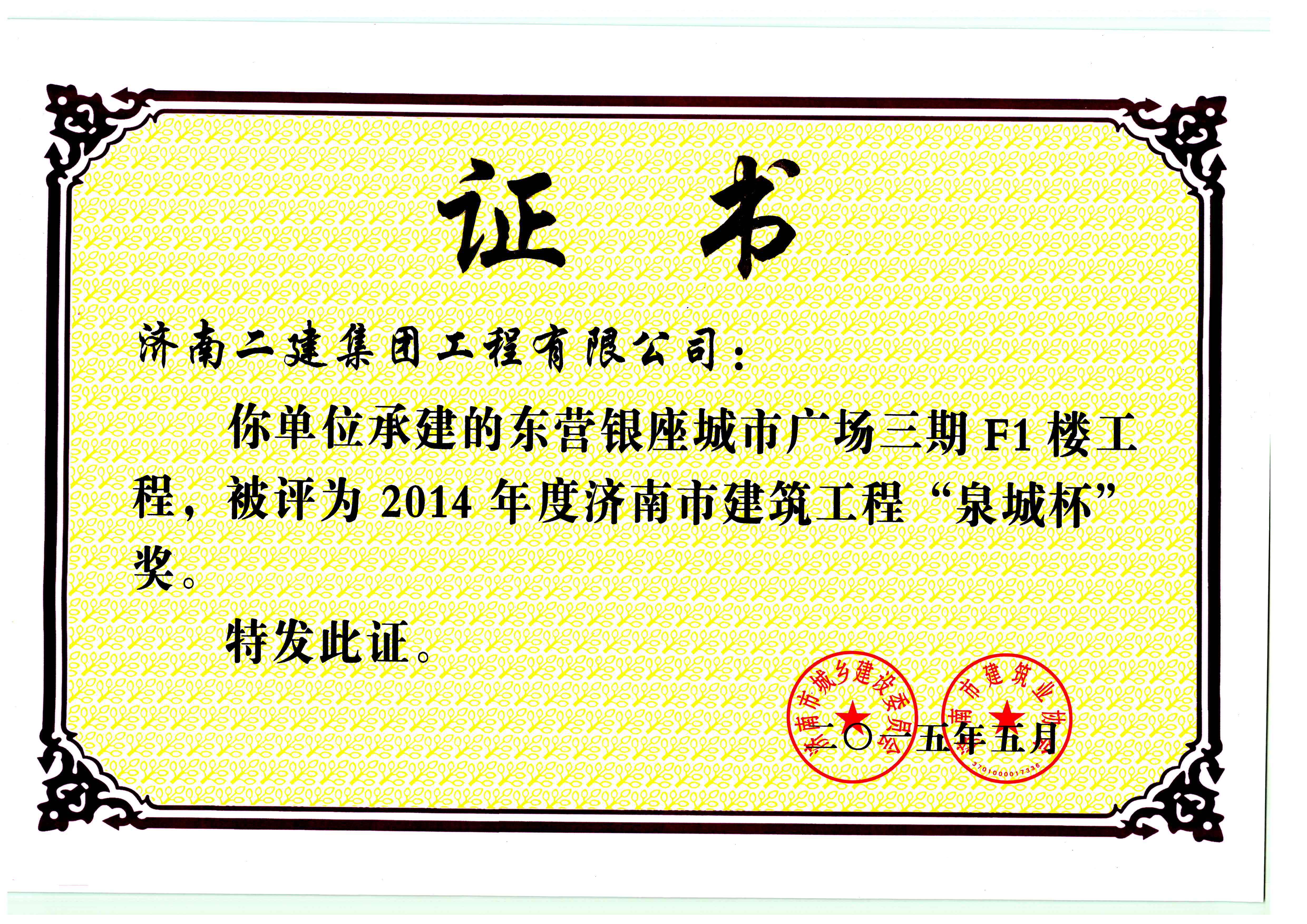 被評為2014年度濟南市建筑工程“泉城杯”獎