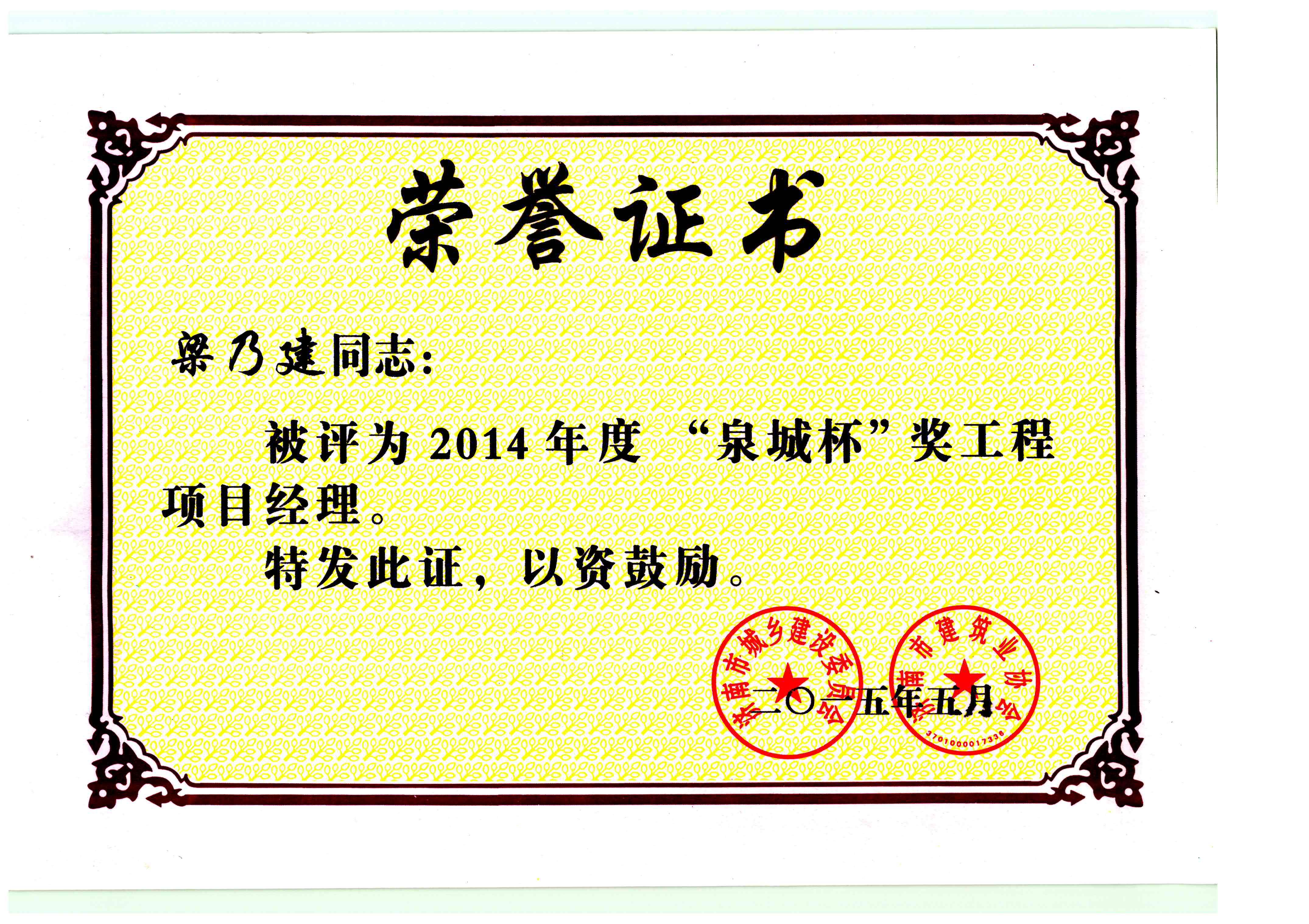 梁乃健同志榮獲2014年度“泉城杯”獎工程項目經理