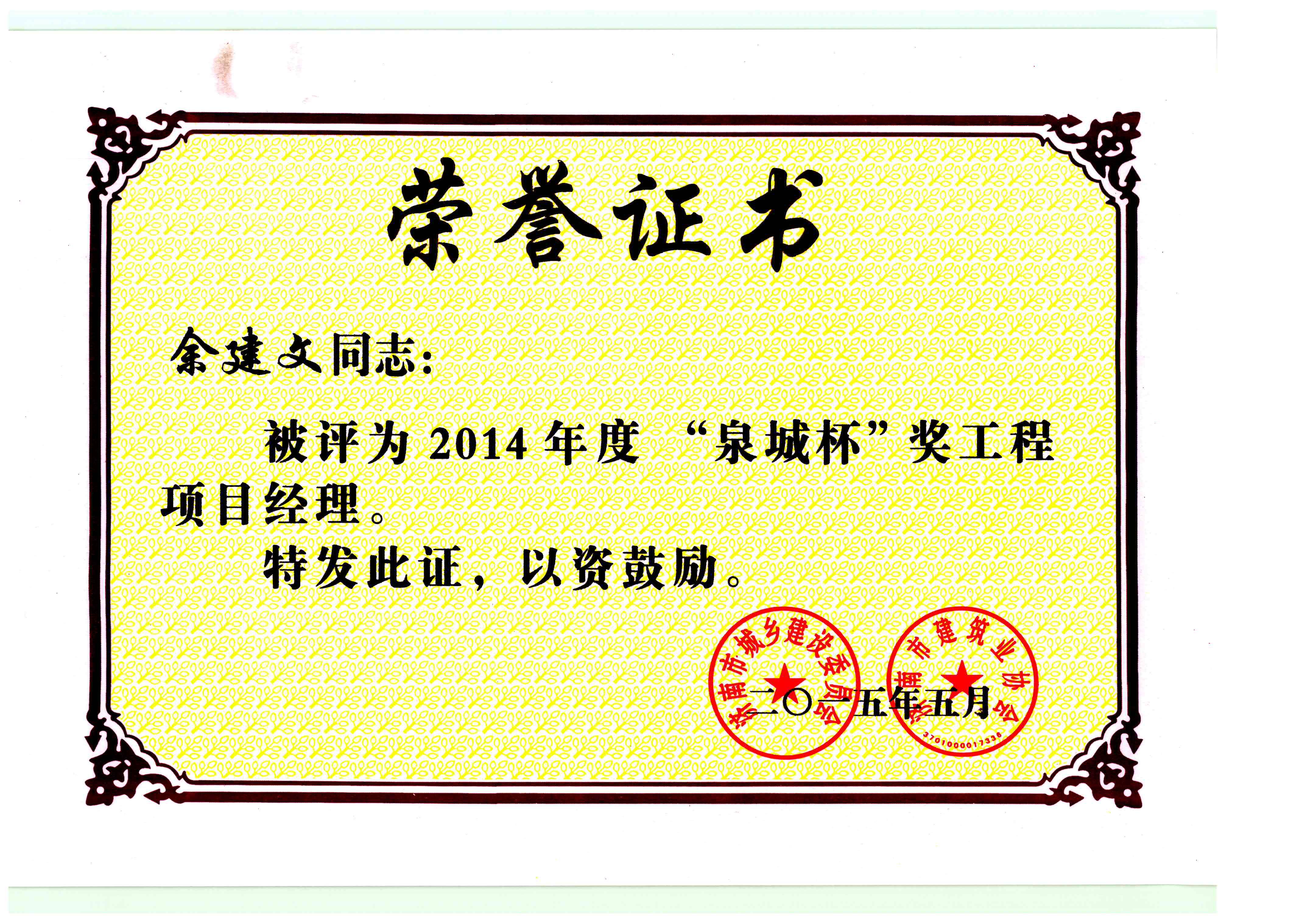 余建文獲得2014年度“泉城杯”獎工程項目經(jīng)理
