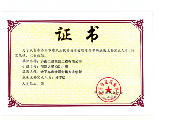 創新之星QC小組“地下車庫滲漏封堵方法創新”成果主要完成人員——馬傳松