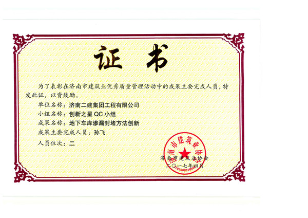 創新之星QC小組“地下車庫滲漏封堵方法創新”成果主要完成人員——孫飛