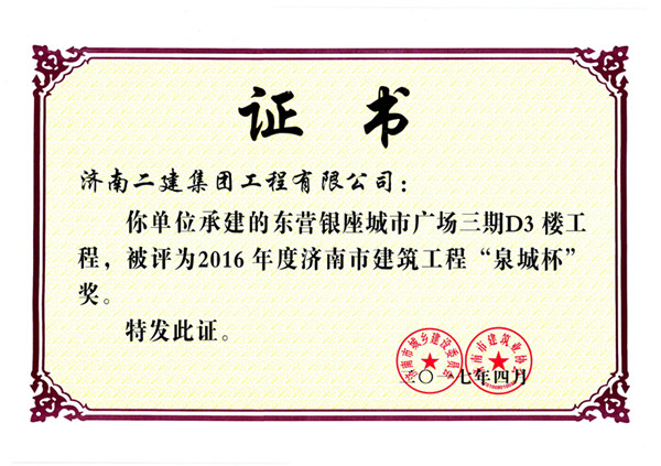集團公司承建的東營銀座城市廣場三期D3樓榮獲2016年度濟南市建筑工程“泉城杯”獎