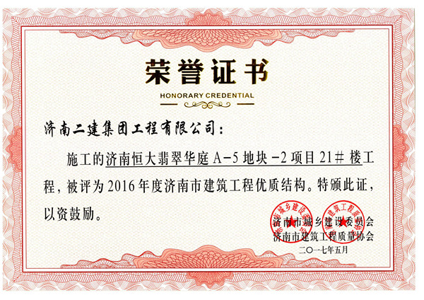 集團施工的恒大翡翠華庭A-5地塊-2項目21#被評為2016年度濟南市建筑工程優(yōu)質(zhì)結(jié)構(gòu)