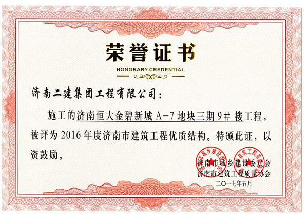 集團(tuán)施工的恒大金碧新城A-7地塊三期9#被評為2016年度濟(jì)南市建筑工程優(yōu)質(zhì)結(jié)構(gòu)